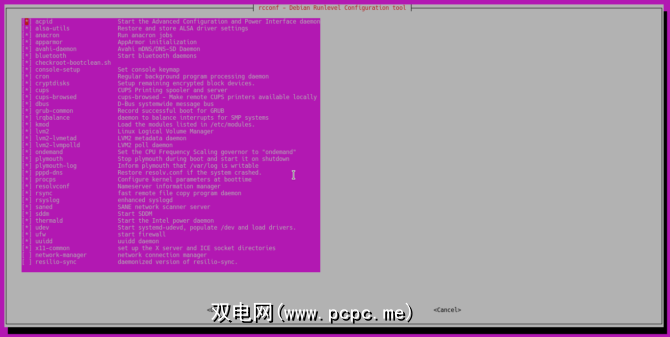 对于许多用户, rcconf 工具(与上述服务)将满足您的所有需求。文本用户界面(TUI)列出了所有可用的服务。您可以使用箭头键在列表中上下移动,并使用空格键切换服务是否应启动(带有星号)。使用Tab键在列表和确定 / 取消按钮以及空格键之间移动,也可以选择它们。