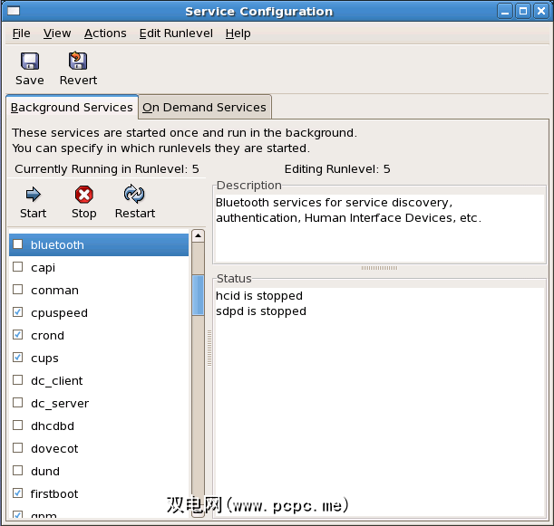 Red Hat开发了 Service Configuration Tool (服务配置工具),它是一个图形应用程序,默认情况下也出现在其派生产品中,例如CentOS和Fedora。它提供了与上面的 rcconf 相似的列表,并提供了可以检查和取消选中服务以将其设置为默认运行或不运行的类似列表。它还提供了允许您启动/停止/重新启动这些服务的按钮。