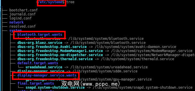 请注意上图中的目录如何具有“ this.thing。想要"之类的名称。这表明 systemd的“按需" “行为"-当某些“想要"蓝牙访问并且满足条件时, systemd 将为其启动服务。