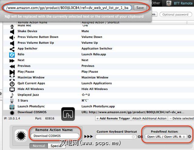 该设置涉及在BTT桌面客户端上选择BTT Remote,创建一个新的远程操作通过添加预定义的打开URL操作,并插入要下载的指定URL。