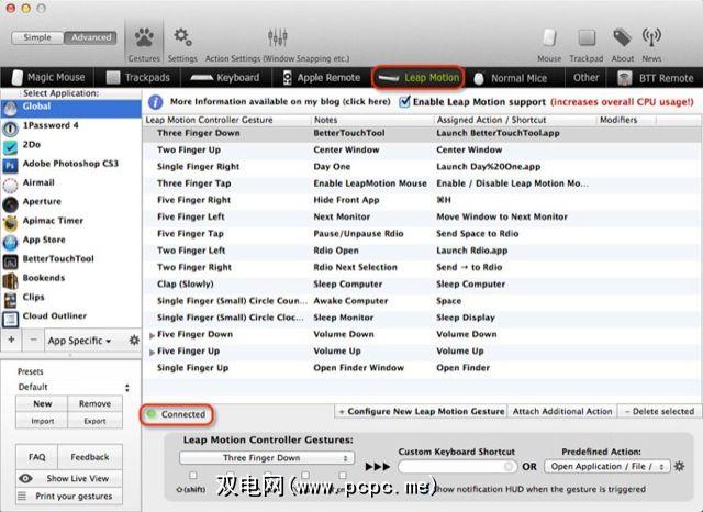 简单地使用Leap Motion需要将控制器连接到Mac。如果您不是BetterTouchTool的当前用户,则应先学习如何使用该应用程序,然后再使用Leap Motion进行设置。连接设备后,最新版本的BTT将能够识别Leap Motion。