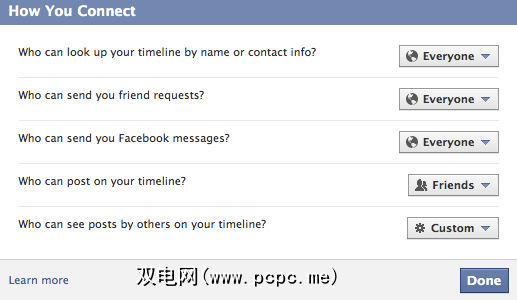 如果您以前控制了哪些朋友可以查看您墙上的信息,则此设置将迁移到您的时间轴上。遗憾的是,Facebook不允许您控制哪些朋友可以发布到您的留言板/时间线。要么是您所有的朋友,要么就是您自己。因此,您需要控制哪些人可以查看您的朋友写的内容。