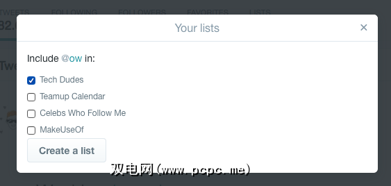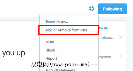 如上所示,您需要做的就是转到该人的Twitter页面,并在设置区域中是一个选项,上面写着“从列表中添加或删除"。然后会列出您的列表,如果还没有列表,则将要求您创建一个列表。