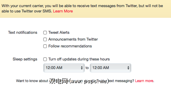 适用于没有智能手机的人,这些人依靠短信从Twitter接收消息(并根据您所在的位置发送推文)。使用此设置,您可以指定要接收的通知以及何时关闭通知,这样您就可以安静一些。因此,很明显,您会选择在夜间进行操作,以使您的电话不会不断收到新消息,并唤醒您和其他人。