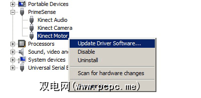 为此,请打开设备管理器并找到< em> Primesense 部分。应该列出三个设备。右键单击用于 Kinect Motor 的计算机,然后选择更新驱动程序软件。