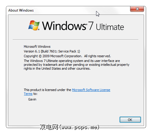 要使其正常运行,您必须已经在运行Windows 7 Service Pack1。按 Windows键,键入 winver ,然后按 >输入。这将向您显示您正在运行的Windows版本。如果显示Service Pack 1,如下图所示,我们很好。如果不是,请单击此链接转到Windows 7和Windows Server 2008 R2 Service Pack 1下载页面。