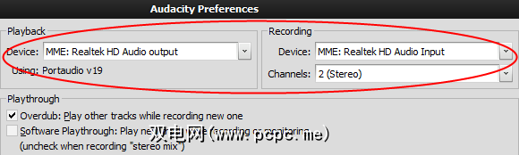 启动Audacity,选择编辑首选项。在音频I / O 部分中,将播放和录制设备专门设置为插入电缆的声卡。请勿在Windows PC上使用 Microsoft Sound Mapper 。