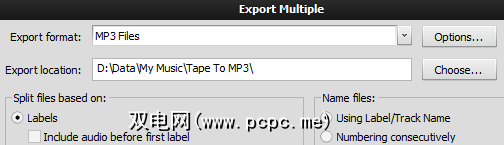 选择 File-Export Multiple ,选择MP3文件作为导出格式。单击选项以使用内置的预设来选择MP3的质量。较高的质量会产生较大的MP3文件。您可以使用不同的选项多次重复导出并检查结果。您还可以指定元数据标签,以便更轻松地在iTunes中整理曲目。