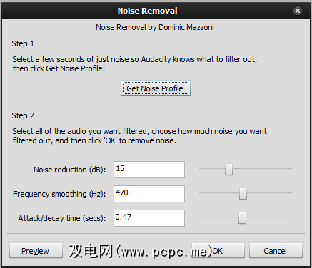 选择去除效果噪声,然后单击获取噪声配置文件 。现在,通过选择全部编辑来选择整个曲目,然后再次选择去除杂讯。将 Noise Reduction(dB)滑块设置为大约10到20,具体取决于源中的噪声水平,将其他两个滑块设置在中间,然后单击“确定"。您可以通过播放曲目,使用编辑-撤消并尝试使用不同的噪声样本和滑块级别来查看结果。