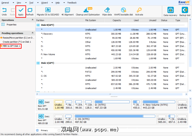 将MBR转换为GPT的第二个选项是使用EaseUS Partition Master Professional。坦率地说,使用与Windows磁盘管理屏幕类似的UI,这是两个转换选项中较容易的一项。但是,EaseUS Partition Software有几个其他选项,其中最重要的是将MBR转换为GPT工具。