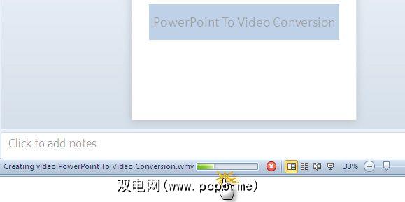 在开始转换为.wmv格式时,PowerPoint的右下角会显示一个进度条,指示步伐。转换所需的时间当然取决于PowerPoint文件的大小。我的15张幻灯片演示文稿花了大约八分钟时间才能拍成电影。