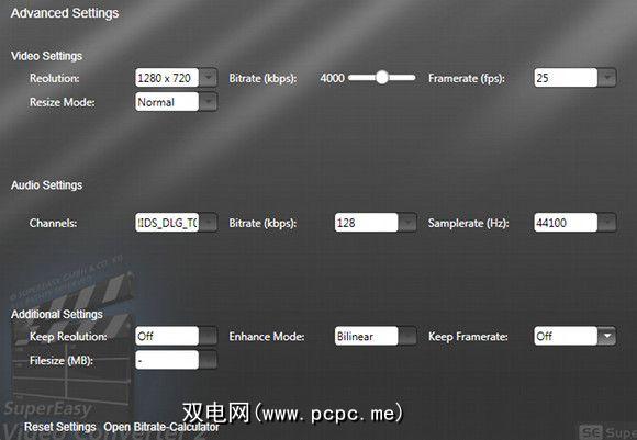 这也是您可以在其中找到“高级设置"菜单的地方。打开它可以更改视频分辨率和帧速率,视频和音频的比特率,音频通道数以及其他一些选项。这些设置中的大多数可让您对质量与文件大小进行微调。高帧速率是可取的,但降低帧速率可以使文件更小。
