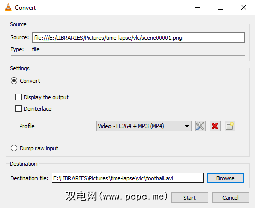 下一步是单击转换/保存按钮,然后选择转换。正确的配置文件应该会自动检测,但是您可以根据需要进行更改。在目标文件字段中,单击浏览以找到将已编译的延时电影保存到的位置,并为其命名。