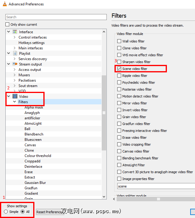 等到视频播放完毕,然后返回工具>首选项并找到视频>过滤器视图。每次在VLC中播放视频时,清除该复选框以禁用后续的帧提取!
