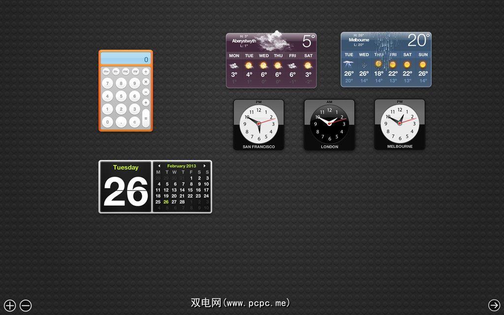 OS X仪表板仅仅是放置小部件(如时钟,日历等)的地方。您可以随意拖动窗口小部件并对其进行排列,尽管没有办法以一种整齐的方式自动进行排列。