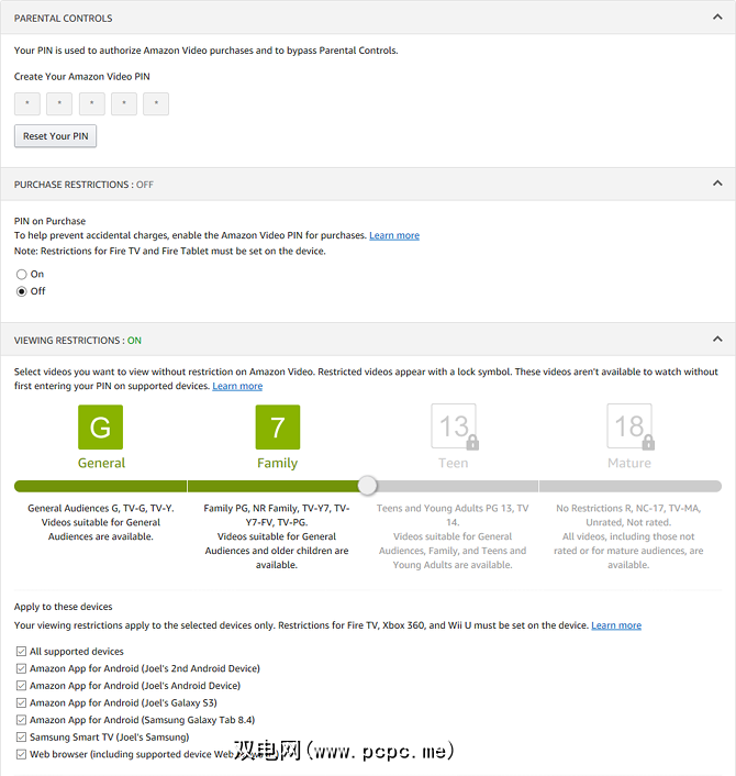要进行设置,请转到Amazon Video Settings并向下滚动到Parental控制部分。创建一个五位数的PIN以启用该功能。有两种类型的限制: