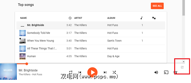 查找安装链接并不容易。首先,开始播放Web应用程序中的任何曲目。然后,您需要在窗口底部的“正在播放"面板的右上角找到对角箭头。