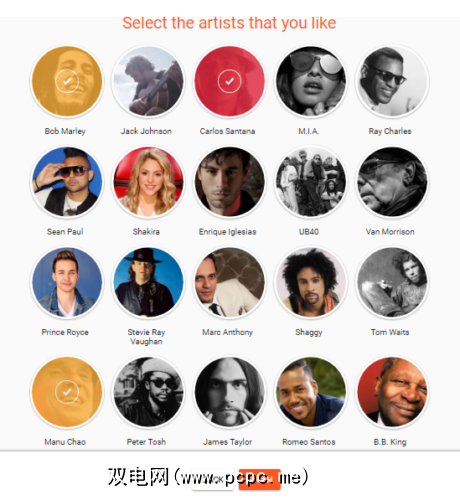 现在,该应用程序将向您显示来自所选样式的建议艺术家列表。再次,选择任意数量,然后单击完成。