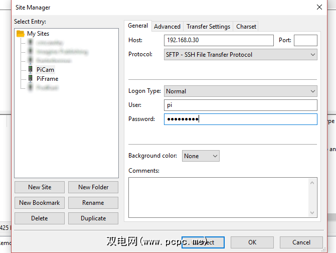 继续填写表单,为协议选择 SFTP – SSH文件传输协议,为登录类型选择 Normal 。输入用户名和密码的当前Raspbian用户名和密码(默认情况下为 pi 和 raspberry )。您可能要单击重命名为连接指定一个描述性名称-如果您定期使用FileZilla,这将特别有用。