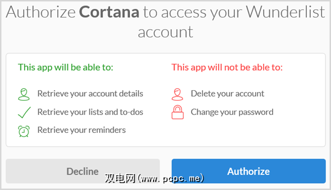 如果您是现有的Wunderlist用户,则可以使用Microsoft,Facebook,Google或Wunderlist凭据登录。如果您是新用户,请选择创建帐户链接以设置您的帐户。然后,如果您想记住用户名和密码,请单击授权按钮以允许访问,并在最终屏幕上单击是。