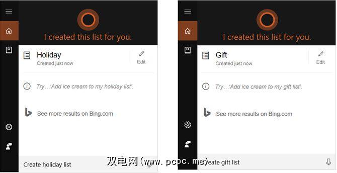 另一个方便的地方Cortana可以帮助您的命令是查看现有列表。您可以输入或说出显示假期列表,显示事件列表或显示购物列表。此命令将显示列表中的所有项目。