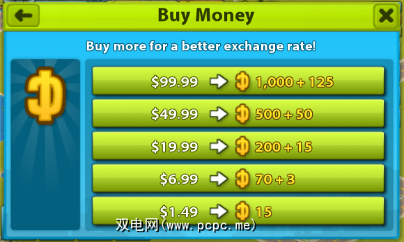$ 210在游戏中几乎没有钱,这就是为什么升级建筑物是一个好主意的原因。说到钱,游戏可以很好地将您的血汗钱转化为游戏中的钱。实际上,游戏中有两种不同的货币类型。一个叫做“ CountryBucks"(我在上面有23个),另一个叫做Game Dollars。让我们看一下CountryBucks的汇率: