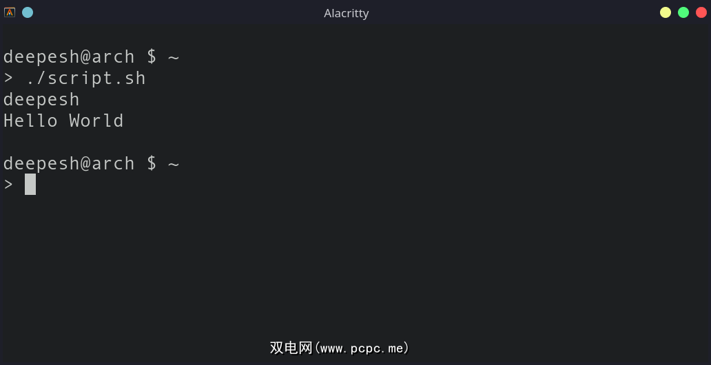 ./script.sh输出将显示您在脚本文件中指定的用户名和字符串“Hello World”。