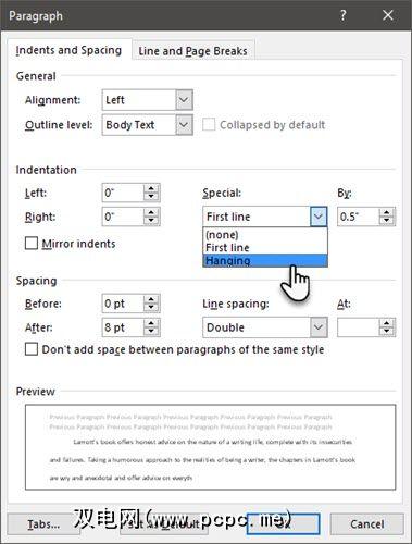要设置悬挂缩进,您还可以转到 Ribbon> Paragraph>点击段落设置箭头以显示对话框。在缩进下,点击特殊>悬挂。默认情况下,悬挂缩进量设置为0.5英寸。