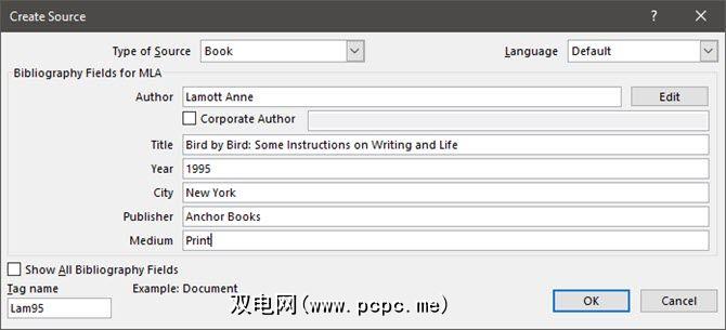 如果选择添加新来源,请输入所有引文创建源框中的详细信息。单击确定。