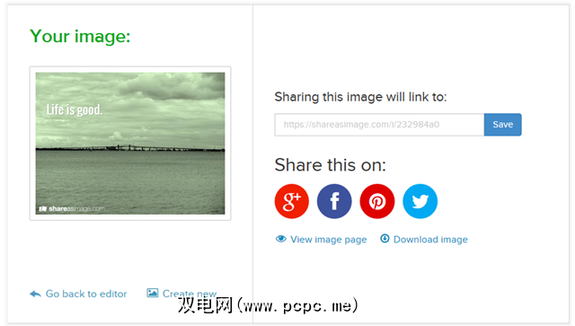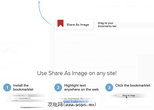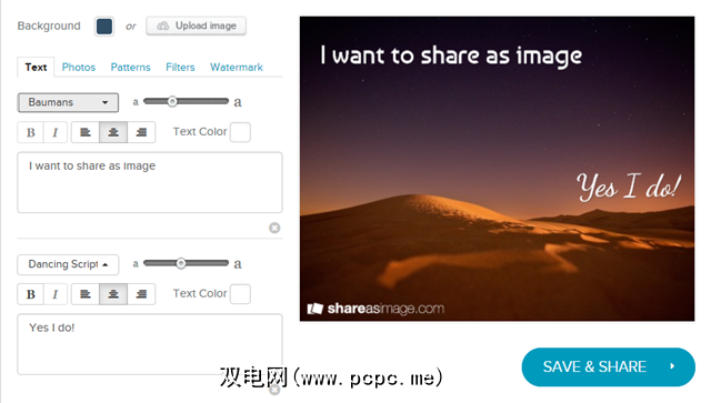 在任何网站上,突出显示要共享的文本,然后单击“共享为图像"书签。这将打开“另存为图像" Web应用程序,其中已包含突出显示的文本。现在,您要做的就是完成设计。