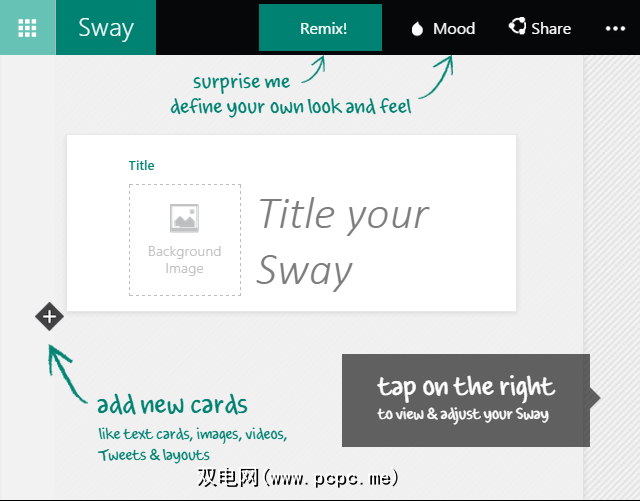 Sway是用于构建基于云的演示文稿的新颖工具。 Sway提供了快速的设计体验,专注于从Web或计算机获取的图像,文本和视频的整理。