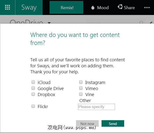 其他所有方法都失败了,如果您的灵感来自设计灵感,那么Microsoft认为可以添加“ Remix"按钮。一旦您将媒体,文本和任何链接放到Sway中,用户就可以点击“ Remix"来做到这一点-观看Microsoft Sway重新设计您的内容。继续点击“混音",您将体验sway当前的功能范围。
