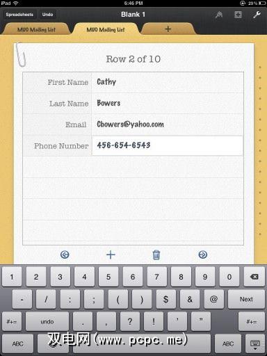 您的表单现在可以使用了。同样,您无法自定义它,但是请注意它的外观比电子表格更好。要对其进行测试,请填写几行。注意,因为您将每个单元格设置为“文本"格式,所以会弹出文本键盘,而不是数字键盘。您可以使用“下一步"按钮移动下一个空白文本框。要移至新记录,只需点击键盘上方的箭头按钮。要删除键盘,请点击右下角的小键盘图标。