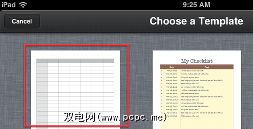 在Template(模板)部分的左上角将显示一个标准电子表格。点击它。 (注意:在应用程序的电子表格部分的《入门手册》中,还有其他有关创建电子表格的说明。)
