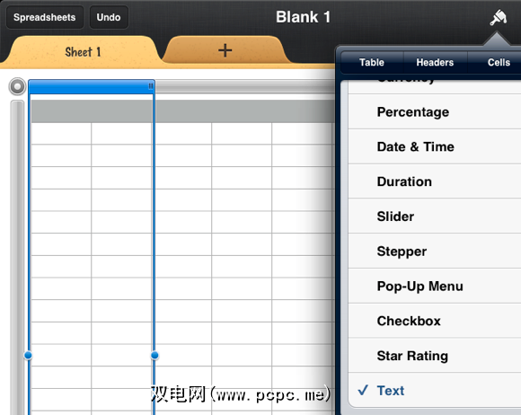 在仍然存在手柄的情况下,点击第一列上方的,然后选择“画笔"图标和“格式"按钮。向下滚动并选择“文本",它告诉Numbers您希望此列为文本字段。稍后您将看到为什么这很重要。对所有列都执行此操作。