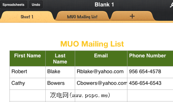 现在,当在电子表格上点按时,您应该会看到输入的所有联系数据。