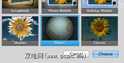 现在选择旅行相册,然后单击工具栏中的“创建"按钮并选择“幻灯片放映" 。 iPhoto将为您选择的照片设置一个单独的文件夹。接下来,单击“主题"按钮,然后选择“位置"主题。
