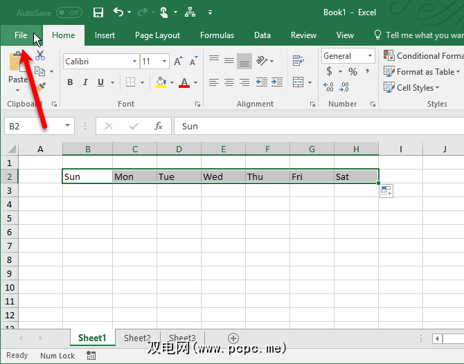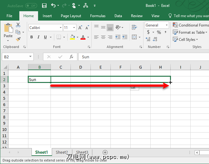 在单元格 B2 中键入 Sun (星期日)。然后,将光标放在单元格 B2 的右下角,直到变成加号,然后向右拖动到单元格 H2 。