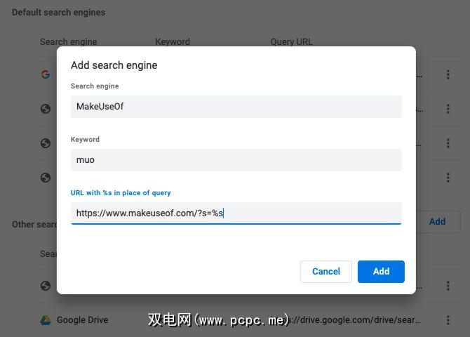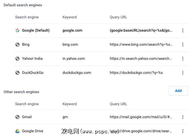 惊讶地在这里看到您尚未添加的搜索引擎?那是Chrome在工作。从网站搜索后,Chrome会自动将搜索引擎添加到列表中。因此,如果您之前已经搜索过PCPC.me,则应该在其中看到一个列表。如果没有看到,请单击添加按钮以手动添加。