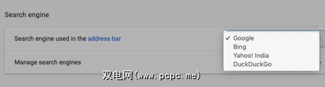 如果您不想使用Google Chrome搜索引擎,可以从Bing,Yahoo和DuckDuckGo等其他选择中选择。要切换到其中之一,请点击更多工具栏按钮(三个点垂直放置)。在显示的Chrome设置页面上,向下滚动至搜索引擎部分,然后从地址栏中使用的搜索引擎下拉菜单中选择所需的搜索引擎。<