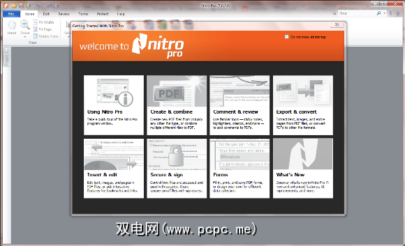 Nitro Pro 7的首次启动将显示“入门"屏幕,突出显示该应用程序的某些功能。您可以通过在启动时不显示复选框轻松禁用此功能,但是值得花点时间查看提供的各种任务。