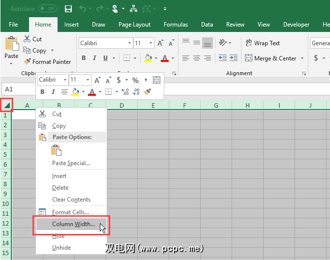首先,通过单击工作表网格左上角的框,选择工作表上的所有单元格。然后,右键单击任何列标题,然后选择列宽。