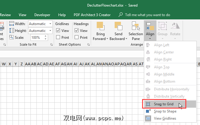 单击页面布局标签。然后,在排列部分中单击对齐,然后选择对齐网格。启用此功能后,菜单上的 Snap to Grid 图标会以灰色框突出显示。