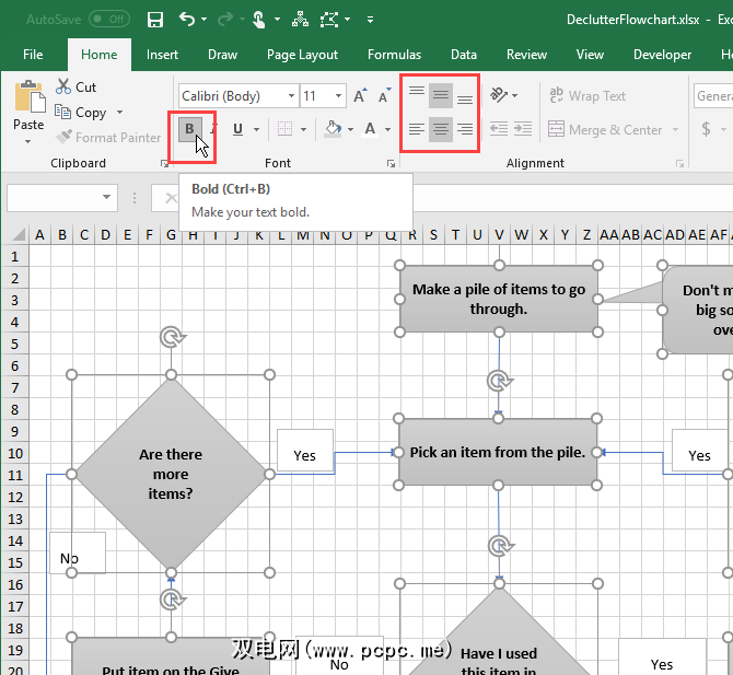 单击 Home 标签,并使用 >字体和对齐部分来设置文本格式。例如,我们使用 Alignment 部分中的 Center 和 Middle Align 按钮将文本在形状中水平和垂直居中。然后,我们对所有文本应用 Bold 。