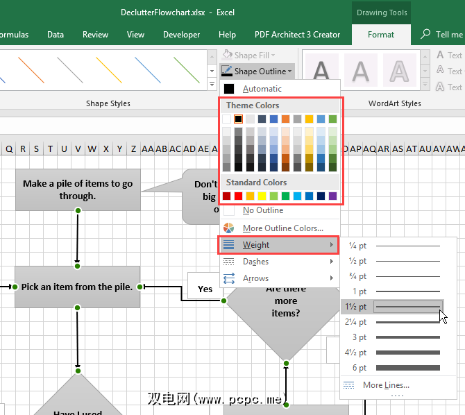点击 Shape Styles 部分中的 Shape Outline ,并从< strong>主题颜色部分或标准颜色部分。然后,在同一菜单上,转到重量,然后从子菜单中选择连接线的厚度。