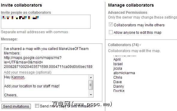 Google使在地图上进行协作非常容易。在查看其中一张自定义地图时,请点击地图左侧垂直菜单左上方的 Collaborate 链接。现在,添加您想要邀请的人的电子邮件地址,设置高级权限,添加一条个人消息以使邀请对人们有意义,最后发送您的邀请。