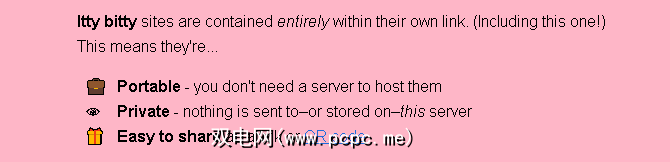 它的工作原理是:itty.bitty.site通过通过其URL加载来创建小型站点。换句话说,您的网站是在其链接中存储和显示的。