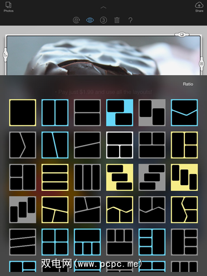 例如,上面的屏幕快照显示了所有可用的布局FrameMagic提供,但要当心!您实际上不能使用灰色的,只能使用蓝色和黄色。如果要使用灰色的,则必须获得应用程序提供的许多应用程序内购买之一-在这种情况下,是高级版面设计套件。