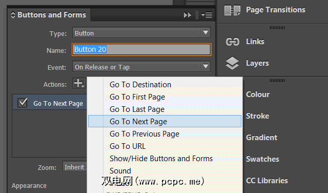 单击操作设置与您的按钮类型相对应的操作(以便在单击电子杂志时移动到上一页或下一页),然后单击事件下拉菜单以设置适当的操作(例如发布时或点击,点击时等)