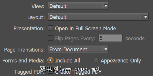 这将打开“导出到交互式PDF"选项框。这提供了设置页面转换和演示选项的功能–您可以使用这些选项和其他选项来查看最喜欢的结果。只需确保已将表格和媒体选项设置为包含所有,以包括您已设置的每个交互式元素。